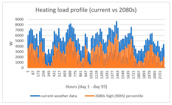 A comparison of the two heating load profiles between the current weather data set and the 2080s high (90th) percentile data over the time period of 1 January and 4 April is shown in Figure 23. It indicates that the heating load in the latter weather data set declines steeply with a reduction of 36.72% between the two climatic variations.