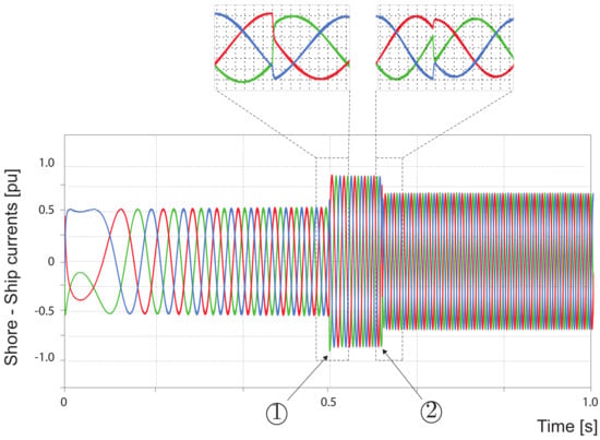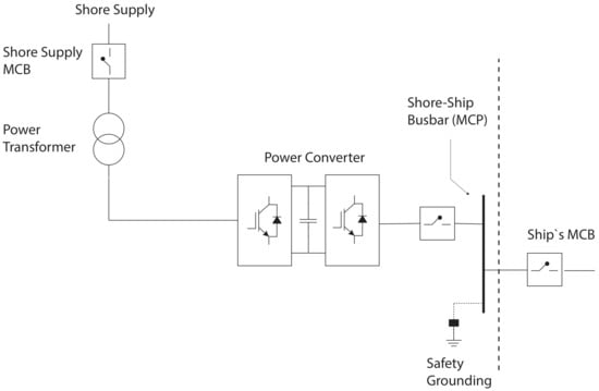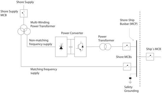 As shown in Figure 1, in the classical configuration of the cold-ironing system, the shore supply is fed to the ship via two different distribution lines, using a multi-winding power transformer. One of the output three-phase windings is connected directly to the shore-ship busbar, main coupling point (MCP), which is used when the ship and the shore supply have the same operational frequency. The second output is connected to a power converter, to convert the shore supply frequency, to that required by the ship‘s electrical loads. This arrangement introduces the need for a close/open position selector, to ensure that both main circuit breakers (MCBs) are prevented to operate in the close position, at the same time.