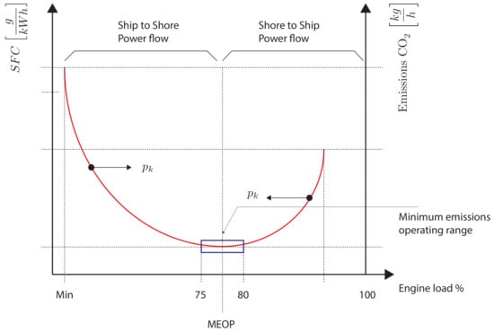 When operating in the low load range, power flows from ship to shore, causing the operation point move towards the MEOP. On the other hand, when is in the high load operation range, the control scheme forces the power flow from shore to ship, causing moving towards MEOP. The optimization strategy and the control scheme are discussed in the following subsections.