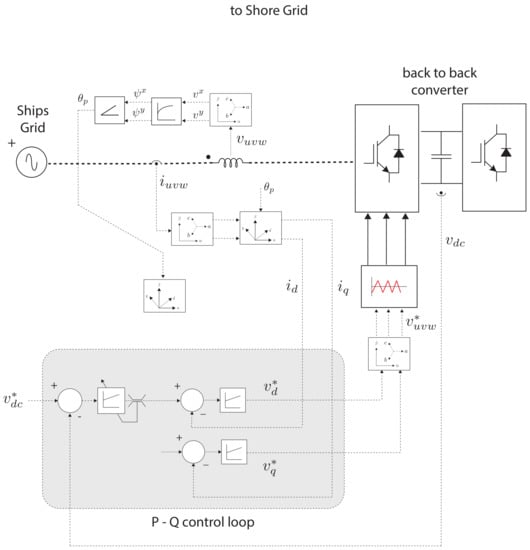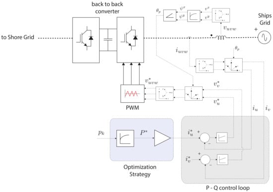 The implementation of the ship side control scheme is provided in Figure 6. As shown, the output of the MEOP optimization scheme, is set as the reference of the active power output of the power converter, while the reactive component, given by is set to zero.