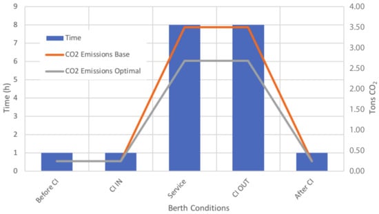 The auxiliary engines emissions were estimated, taking the EEOI equation and applying some operational conditions to the time spent at berth by the ship. A comparison of the emissions profile with and without the proposed strategy, allowed the estimation of the possible emissions reduction that could be achieved.
