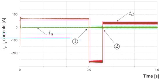 Figure 10 shows the performance of the shore supply, the performance of the b2b converter, in terms of its controlled currents. At low high operational requirements over 95% of rated power, the MEPT algorithm sets active power reference in shore-to-ship supply region, therefore the active power producing current , whereas the reactive power producing current . On the other hand, when entering a low load condition below the minimum SFC point, the MEPT, forces the power converter to operate in the ship to shore region, therefore the active power producing current , while the reactive power producing current .