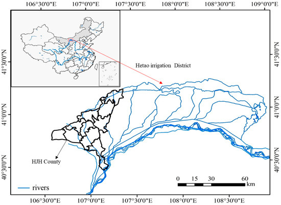 The HID is situated in the Yellow River Basin, Inner Mongolia Autonomous Region, North China (Figure 1). It is one of the major grain and oil-producing areas in China, which has made a large contribution to food security in North China and has played a pivotal role in agricultural production trade between Inner Mongolia Autonomous Region and its border countries (Russia and Mongolia). The HID has a long history of agricultural civilization dating from the Han dynasty. It is the largest gravity-fed irrigation district in Asia with an irrigated area of 5.74 × 103 km2 [30], and in 2019 this area was listed on the world heritage list of irrigation projects. The climate in this region is arid continental monsoon, with hot and moist summers (annual average air temperature 23 °C, highest 35 °C) and dry and severely cold winters (annual average air temperature −10 °C, lowest −32 °C) [31]. The annual precipitation is around 150 mm, and the annual potential evaporation is 150 mm [32]. The Yellow River is the water source for irrigation in this area, where surface irrigation technology is mainly applied. Soils are classified as siltic irragric anthrosol in this region [33].
