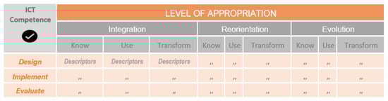 It adopted the UNESCO Model of ICT Standards and Competencies, a model of ICT skills for teaching based on the levels of appropriation of ICTs. This model integrates the teaching skills for the design, implementation and evaluation of educational practices supported by ICT, and the different modalities of knowledge representation (know, use, and transform). At the initial level of appropriation (integration), teachers use ICT as a tool to optimize the presentation of content, communication, and transmission of information. At advanced levels of appropriation (reorientation and evolution), the internal dynamics of educational practices are enhanced by the inclusion of ICTs. ICTs become tools that facilitate the construction of knowledge (reorientation) or even become powerful mediating tools that generate unthinkable dynamics without the presence of ICTs (evolution). It was possible to summarize these competencies in
