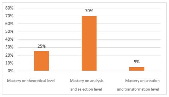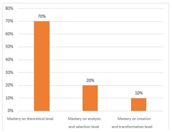 Figure 3 shows the data collected about the metacognition of the teachers and their perceptions of knowledge regarding the theories related to digital competence, showing that a large part of the studied teaching group (70%) affirmed and believed that they controlled and presented the domain necessary both for the analysis and for the selection of a technology to be implemented in their classes. A quarter of the sample claimed to stay at the theoretical level, which made the sustainability of the use of tools unfeasible, but on the contrary, 5% believed they go further and claimed to be able to carry out transformation processes based on the used technologies.