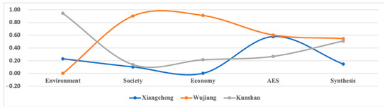 As shown in Figure 3, the evaluation results of the environmental criteria of Kunshan are the highest, followed by Xiangcheng, with Wujiang having the lowest figure; the evaluation results of the social criteria are the highest in Wujiang, the second in Kunshan, and the lowest in Xiangcheng; the evaluation results of the economic criteria are the highest in Wujiang, followed by Kunshan, with the lowest results in Xiangcheng; the evaluation results of the AES criteria are the highest in Wujiang, followed by Xiangcheng and Kunshan.