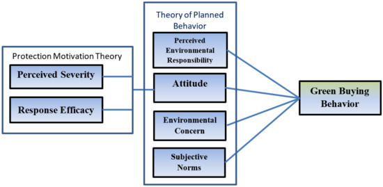 Furthermore, this paper aims to address the following gaps existing in the previous literature. First, there is limited literature on green behavior from the perspective of developing nations. A couple of studies [42,43] analyzed the marketing mix responsible for Bangladesh’s progress regarding the customer’s attitude towards green marketing. The other existing studies primarily deal with issues of organic foods [44,45] and the green buying behavior of grocery product [46,47,48]. Second, in the consumer behavior analysis, two prominent models were commonly found: one is the theory of reasoned action (TRA) model [49], and the other is the theory of planned behavior (TPB) [50], which is an extension of TRA and includes few constructs. These classical model designs or their modified version were used extensively by several researchers to validate sustainable buying intentions and behaviors [24,51,52,53,54]. There is a need to apply other theories independently or in a combination to provide solutions to unanswered questions in various cultural contexts. Currently, there has been no study that uses the Protection Motivation Theory (PMT) on green buying decisions in South Asian countries, particularly Bangladesh. Besides this, the existing studies [45,46] failed to use the theoretical frameworks of any of the working theory in this field. The PMT theory explains how the perception of the severity and response efficacy affect customers’ buying behavior under risk and coping appraisal measurement. Thus, this should be integrated with the TPB model to enhance its explanatory strength.