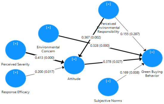 Most times, continuous disparity exists between cognitive factors and behaviors. Without the influence of social factors, an individual’s cognitive understanding may not actualize as individual behavior. In some situations, the one cognitive aspect allows others to attain real behavior. The efficacy of response implies that the potential of the action and the perceived option to impact any problem should be considered [144]. Furthermore, Eden [144] pointed out that real behavior is often positively correlated with the perceived severity of ecological issues and efficacy. Moreover, environmental responsibility increases when individuals have trust in the importance of their pro-environmental actions and are viewed as responsible agents in contrast to other social agents [145]. The mediating role of attitude between the severity of the threat, the response efficacy, and green buying behavior has not been tested widely [146], and must address the actual behavior gaps. Therefore, the following hypothesis is developed: