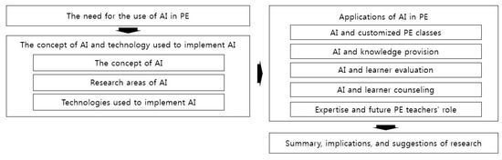 Based on the concept of AI and its research areas, this study examined its use it in PE. Additionally, this study focused on analyzing areas where AI can be applied in terms of sports educational technology, customized PE classes, knowledge provision using AI, learner evaluation, learner counseling methods, and future PE teachers’ expertise and roles. However, the analysis of these areas provided only a concept of the direction overall AI utilization should take in each area, and the specific utilization method was not fully explained. Therefore, more detailed, practical, and in-depth studies of each area should be carried out in future.