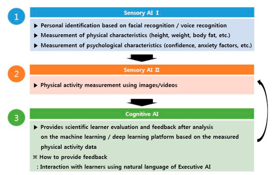 For learner-centered customized PE classes, individual learners’ physical condition, level of physical activity achievement, and psychological characteristics should be objectively measured through an empirical evaluation. Sensory AI can be used to objectively measure physical activity achievement level according to an individual’s physical condition, enabling them to be identified based on facial recognition and voice analysis, alongside analysis of physical activity image and video. Such measured data can then be analyzed on machine learning and deep learning platforms using cognitive AI to provide learners scientific evaluation and feedback. This method can also interact with learners using the natural language of executive AI, allowing learners to diagnose and develop their performance levels and improvements (Figure 3).