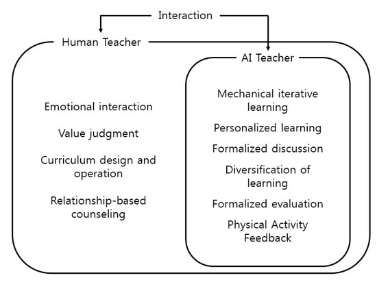 Based on these discussions, the complementary roles of human and AI teachers can be represented as shown in Figure 4. In other words, for AI teachers, mechanical iterative learning, personalized learning, formalized discussion, diversification of learning, and formalized evaluation can be performed, whose data is relatively easy to algorithmize and accumulate. By providing a complete form of personalized education and a number of different forms of learning situations that cannot be realized perfectly in the current PE environment, AI can build a learning environment where learners would be more interested and participate more actively. Furthermore, by dealing with formalized work with AI, human teachers will be able to focus more on other aspects, such as design and operation, and establish relationships.