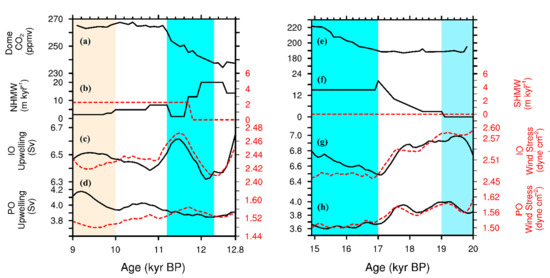 Enhanced upwelling during the H1 and the YD would likely bring more carbon-rich water to the ocean’s surface. The reduction in the sea ice coverage would enhance the outgassing of CO2 [42,43,97]. Furthermore, the ocean water during the H1 and the YD was warmer than the LGM and decreased the solubility of CO2. The TraCE-21ka-modeled upwelling records during the H1 and the YD were consistent with the increase in atmospheric CO2 concentrations from ice core records [11] (Figure 1a,e).