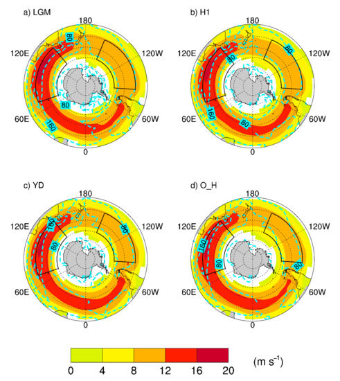 TraCE-21ka simulated a pronounced zonal asymmetry during the LGM with an austral winter double jet at the SO’s latitudes, which agrees with earlier studies [26,64]. This asymmetry in the Southern Hemisphere’s westerly winds weakened during the H1 and the YD and was replaced by a single mid-latitude jet during the onset of the Holocene. Previous studies have mostly focused on the deglacial migration of the Southern Hemisphere’s subtropical westerly jet and proxy moisture data as an analog to show the deglacial change of the zonal average Southern Hemisphere westerlies’ circulation. However, it is essential to study the change in the strength of the surface Southern Hemisphere westerlies instead of the general Southern Hemisphere westerlies’ circulation. Moreover, it is crucial to move beyond the average zonal perspective of the SO circulation.
