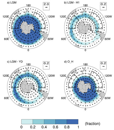The TraCE-21ka-modeled Antarctic sea ice coverage in the LGM was at a maximum in the IO sector (greater than a 70% sea ice fraction) in comparison to the PO sector (≈30% sea ice fraction) (Figure 4a). Figure 4 illustrates the deglacial decrease in the Antarctic sea ice coverage, where its magnitude and range shrunk from the LGM to the O_H. In particular, during the O_H, the PO sector was entirely devoid of sea ice. The model simulation suggests that the SO Antarctic sea ice coverage followed a similar trend to the deglacial decrease of the Southern Hemisphere surface westerlies and wind stress.