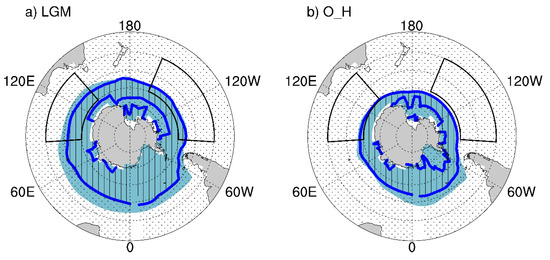 Figure 5 illustrates the equatorward expansion of the denser surface water in the LGM. The sea ice boundary (defined as the ocean surface area’s margin that is covered with more than 5% sea ice fraction) during the LGM roughly overlapped with surface density ranging from 27.5 to 27.7 kg m−3. Figure 6 highlights the close overlap between the transition from a negative to a positive buoyancy flux (solid blue contour line represents the boundary) and the edge of the ocean surface area covered by more than an 80% sea ice fraction. The simulation showed that in both of the ocean sectors, the latitudinal position of the transition zone of the buoyancy flux shifted poleward by ≈11° from the LGM to the O_H (Table 2).