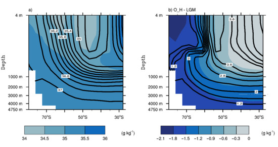 The simulation showed that the extensive coverage of sea ice during the LGM led to a massive influx of salt into the ocean compared to the O_H, as shown in Figure 8a. Our results showed that the vertical salinity (illustrated in Figure 7a) and density gradient of the LGM deep ocean water was seven and two times stronger than during the O_H, respectively, as shown in Table 3. This extensive stratification of the LGM deep ocean waters would subsequently lead to low vertical diffusion and less mixing of the LGM waters [92,94]. Regarding the LGM, Figure 8c highlights the intensive freshwater flux into lighter surface waters at the sea ice boundary. Our analysis showed that the LGM meridional salinity gradient was stronger by a factor of nine relative to during the O_H (Table 3). This increase in simulated freshwater flux and meridional salinity gradient would strengthen the glacial upper meridional overturning circulation, which is consistent with [19]. The simulation of the Global Meridional Overturning Circulation (0.5 to 4.5 km depth) during the LGM (Figure 9a) showed an extended lower meridional overturning cell (blue), an upper meridional overturning cell (red), and a shallower Deacon cell (≈45° S to 60° S; red). The LGM lower meridional overturning cell comprising the Antarctic Bottom Water and its derivatives expanded above the average topographic features in the SO to depths of about 1600 m (Figure 9b). Previous studies have also reported expanded lower meridional overturning circulation during the LGM [38,90,95,96]. Our analysis showed that the strength of the maximum lower meridional overturning transport during the LGM was about 1.3 times stronger than during the O_H (Table 3).