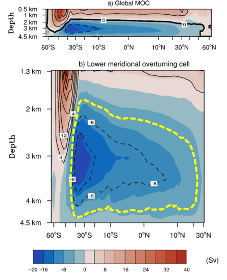 The Global MOC stream function during the LGM (shaded contour interval) overlain with the MOC stream function during the onset of the Holocene (line contour interval). (a) Section of the Global MOC (0.5 to 4.5 km depth) showing an upper meridional overturning cell (red), a shallower Deacon cell (≈45° S to 60° S; red), and a lower meridional overturning cell (blue) (shaded contour interval is 4 Sv and the line contour interval is 10 Sv). (b) Detailed overview of the lower section of the Global MOC (1.3 to 4.5 km depth) (shaded and the line contour interval is 4 Sv) from Figure 9a. It highlights the lower meridional overturning cell (blue). The bold, dashed, and yellow color contour line shows the lower meridional overturning cell’s extent during the onset of the Holocene.