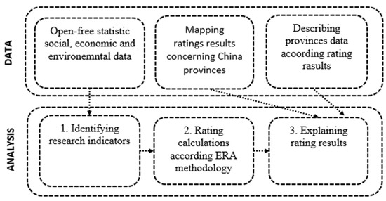 Research data are regionally accurate and were obtained from official China statistical yearbooks and from the Economy Prediction System (EPS) database http://olap.epsnet.com.cn/ and used without validation or additional training. A complete list of research indicators is provided in the Supplementary Materials (see Table S2). In this article, the authors use China inland data for 31 provinces. The workflow of data collection and analysis can be seen in Figure 1. The authors chose 2018 as the year when all the data required for the testing methodology were comprehensively collected: Environmental, economic, and social data were used from the China Environment Statistics Books. Calculations of the protected wilderness areas ratio were carried out according to Vladimir Bocharnikov methodology [22,30]. Regional data concerning pollutants’ emissions into the atmosphere, discharge of polluted wastewater, and waste amounts were taken from official statistical collections. China’s provinces’ performance assessment covers social infrastructure and population, including those not employed in the manufacturing economy.
