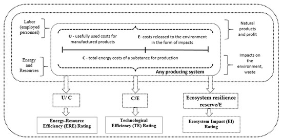 Vladimir Artykhov started developing the ecological system science theory in Russia [45]. As in GST, from three essential elements, relations and composition’ laws, a systematic picture of the entire surrounding reality is created. In this case, U (practical value of manufactured goods), C (total energy costs of a substance for production), and E (costs released into the environment in the form of impact) allow us to determine a complete list of criteria reflecting the most common properties inherent in any production system. The basic set of criteria that give a detailed description of the production systems efficiency allows us to consider the crucial directions of production complexes’ modernization, which are as follows: