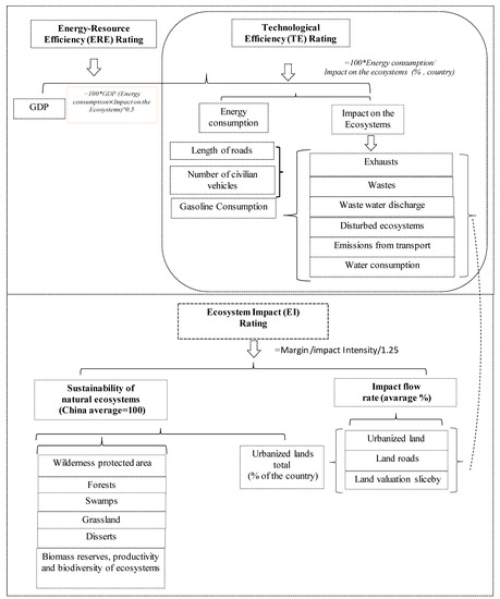U/E—characterizes environmental “purity” and low resource consumption per unit of the final product and can be called environmental efficiency. In addition to the three paired combinations, there is also a combination of all three elements: U/(E × C)—high values of this indicator mean that the production of products exceeds the consumed energy and produced efficiency. Energy resource efficiency is an additional volume of products produced not only at the expense of material expenditures of energy but also the primary changes in the production system’s structure and diversity, using adaptive stability information mechanisms. The U/(E × C) ratio refers to the authors’ EI Rating. The rating methodological scheme is shown in Figure 3.