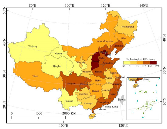 Shanxi, Beijing, and Tianjin showed the highest level in terms of the TE rate factor. Furthermore, the provinces like Sichuan, Chongqing, Guangdong, Fujian, Henan, Shanghai, Shandong, Hebei, Liaoning, and Zhejiang follow this behavior for the TE factor. It can be observed that the regions with relatively high TE are the coastal provinces. Chongqing, Sichuan, Tianjin, and Beijing have a very high economic and educational development level, which can lead to scientific and technological progress. China’s high-tech industries are rapidly developing in these provinces.