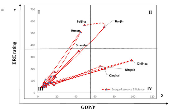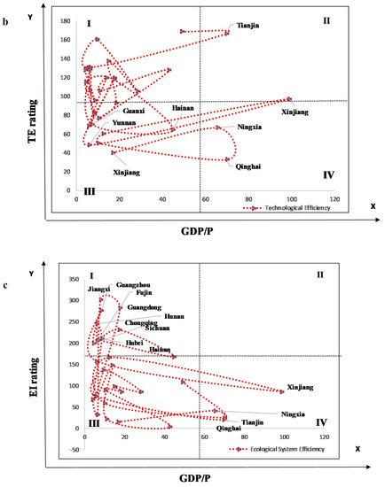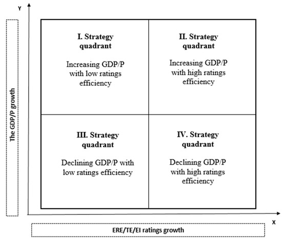 The authors built a strategy matrix for analyzing China’s provinces’ rating evaluation results (see Figure 7 and Figure 8). The strategic matrix consisted of four parts and was based on the assessing the GDP/Population (GDP/P) rate and three ratings—ERE rating, TE rating, and EI rating.