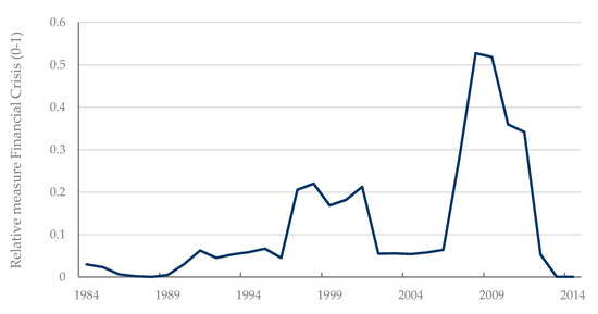 The financial crisis variable is constructed based on the systemic banking crises data from Laeven and Valencia [30]. We focus on this dataset because systemic banking crises are highly disruptive episodes affecting the financial sector. These episodes may be accompanied (and they commonly do) by the depreciation of the national currency. Laeven and Valencia [30] define a banking crisis as systemic when one of the following is observed: (i) symptoms of financial distress in the form of banking system losses, bank runs or closure and (ii) government intervention in the banking system including takeover or merging of one or more important financial institutions. Similar to other determinants, Financial crisis is defined relative to the rest of the world and is constructed as follows: first, we assign a dummy taking the value of 1 if the country is suffering a financial crisis and 0 otherwise, and second, we multiply this dummy by the country’s GDP. Then, this product is divided by the sum of the GDP of all countries facing a financial crisis during the same year. This suggests that when country is facing a crisis, the smaller the number of other economies also in crisis, the greater will be the value of our Financial crisis proxy for country .
