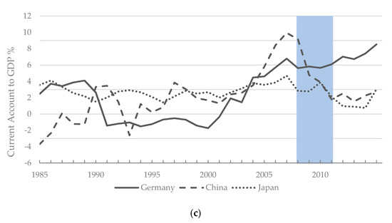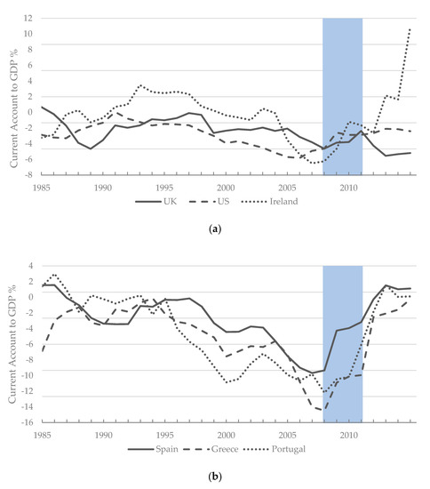 For instance, in 2009, the US exports decreased by 13.8%, while its imports dropped by 22.7%; in the United Kingdom, exports and imports were reduced by 19.6% and 21.3%, respectively, and in Spain, the fall in exports and imports were 17.9% and 28.0%, respectively. Such sharp drops in imports followed from the collapse of output in these countries, particularly given that all the three countries and particularly the former two were at the epicentre of the GFC. The collapse in output, in turn, followed from the deep loss in confidence in the banking system and the credit crunch, resulting in the collapse of the world trade. Consequently, economic activity in the crisis-hit countries remained subdued for an extended period of time, in contrast to the v-shaped recovery enjoyed by the Asian economies in the late 1990s. On average, and as shown previously in Figure 2a,b, trade balance to GDP ratio in these countries enhanced during the period of 2008–2011, allowing the current account in most affected economies to improve over the same period.