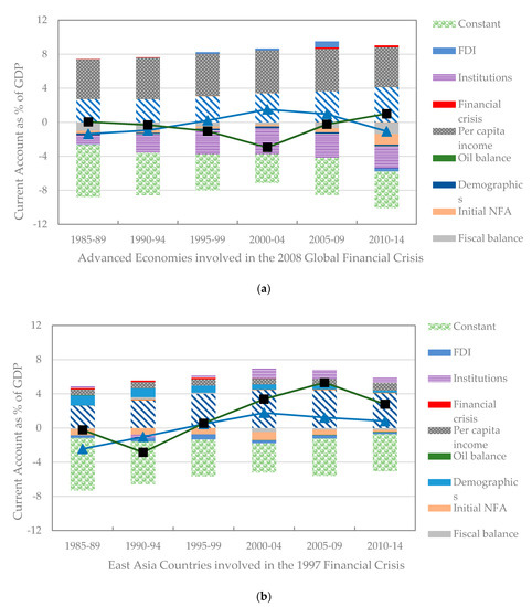 GDP-weighted average-Variable Contributions to Current Account/GDP predicted values: Financial Global Crisis vs. East Asian Crisis. Advanced Economies: Austria, Belgium, Denmark, France, Germany, Iceland, Ireland, Italy, Netherlands, Portugal, the United Kingdom and the United States (a); East Asia economies: China, Korea, Indonesia, Malaysia, Thailand and Philippines (b). Variable contribution to predicted values of current account as percentage of GDP based on estimations using the GLS Random Effects from the model of Table 3, Column 2.