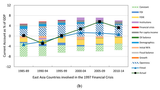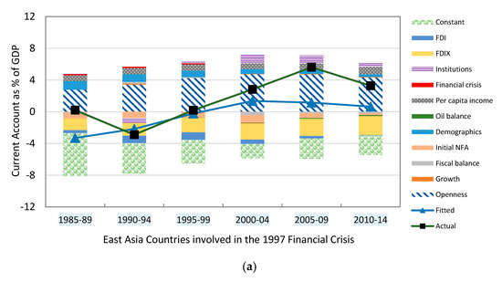 Figure 3 presents the contributions of individual determinants of current accounts in each our nonoverlapping 5-year periods for some of the advanced economies (exhibit a) and the East Asian emerging economies in our sample (exhibit b). It is calculated by computing the contribution of each variable to the current account predicted value. That is multiplying the actual value of each variable by the corresponding variable’s coefficient estimated by RE panel effects, for each country, which is then GDP-weighted averaged to compute the country-group average. Besides the constant term, the highest contribution to current account deficits in our subset of exhibit are the quality of Institutions and fiscal balances. Meanwhile, the level of per capita income, the openness ratio and FDI are factors explaining most of the surpluses. In the subset of exhibit b, the contribution of the quality of Institutions to explain the current account balances is rather small in comparison to advanced economies. Actual levels of the current account are closer to those predicted by fundamentals and by our additional variables—FDI and Institutions specially in the first three subperiods and in the last subperiod for both subsets of countries. The positive net effect of financial crises on current account balances is also visible from both figures. It is clear, however, that the contribution of financial crisis to the current account balances is low in comparison to other determinants in our sample.