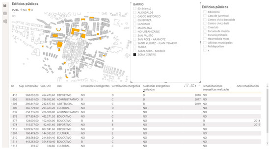 Example of PowerBI city dashboard; public buildings analysis in a Basque urban area (Spain).