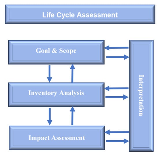 LCA has a standardized methodology, as revealed in ISO 14040 [22] and 14044 [23], which are universally applied by researchers and practitioners. The general LCA methodology provided in the ISO 14040 series is characterized by a technically robust framework that considers every aspect of the product life cycle, including the system up and downstream. The framework provided includes four steps, namely; goal and scope, life cycle inventory analysis (LCI phase), life cycle impact assessment (LCIA), and life cycle interpretation as shown in Figure 1.