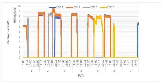 Sample data illustration of a week operation of the 4 Electric Centrifugal Chiller ECC systems.