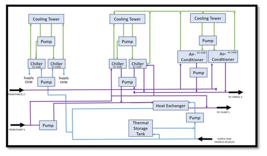 The use of large thermal energy storage (TES) tanks integrated with DC systems, which are charged with chillers during off-peak periods, is an emerging technique that is being rapidly implemented in growing urban cities, especially those with very humid temperatures [6]. This centralized technique presents numerous advantages and improved value compared to standalone air conditioning units. Some of these advantages include reduced energy consumption, cumulative installation, and operation and maintenance cost; improved handling and maintenance; enhanced environmental conditions with fewer emissions; space management; guaranteed service reliability; and longer lifespan [3,4,7,8].