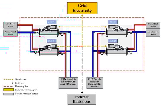 LCA is a systematic analytical tool used for environmental assessment of a products’ entire life cycle. LCA evaluates and weighs a product from the viewpoint of the environmental load and the impact of the burden on the ecosystem, human health, and natural resources [21]. LCA provides a uniquely defined concept in the form of a functional unit which enables for comparison between similar systems. In this study, the function provided is the capacity of chilled water produced by the chiller plant for district cooling. The integrated LCA approach is a chain of linear equations, mass and energy balances representing the compilation and analysis of various system inputs, outputs, and corresponding environmental impact throughout the process of the product life cycle.