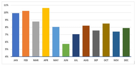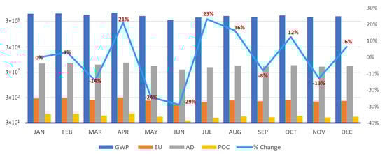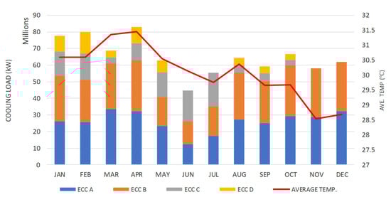 Malaysia is regarded as a maritime country which is located close to the equator, between 112°30′ E and 2°30′ N. The country experiences a tropical climatic condition, with a high temperature, humidity, and illumination. The temperature variation throughout the day ranges from 24–38 °C, with sunshine duration averaging 6 h. The lowest temperature is experienced during night-time [28]. Climatic data provided by the Malaysian Meteorological Department [28,29] is used to compare the monthly chilled water demand trend based on the average monthly temperature. The chart in Figure 6 shows the level of contribution in terms of chilled water production and electricity consumed by the individual ECC systems on a monthly basis.