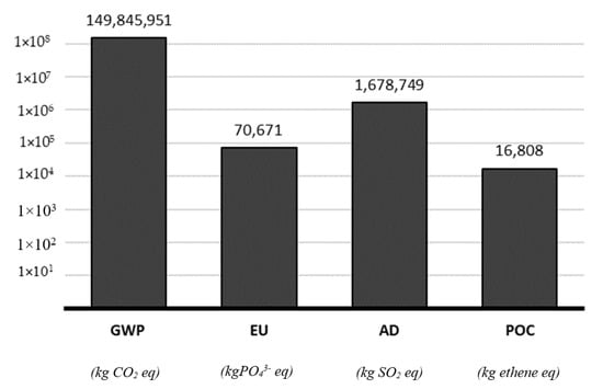 The LCIA categories chosen for this study in quantifying the energy-environmental impact of the FU are listed in Table 2. The characterization factors used for evaluating the non-renewable (fossil fuel) energy combustion and its emission was acquired from the ILCD 2011 impact assessment method [31,32]. Table 3 shows the characterization (equivalency) factor used in estimating environmental impact in this study.