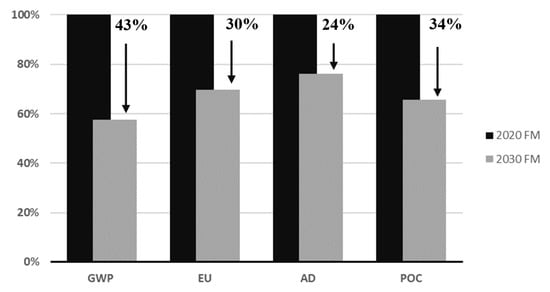 LCIA results quantifying the environmental gains in all selected environmental categories in both scenarios are presented and compared in Figure 13. As observed from the results, an average of 33% reduction is achieved across all selected environmental categories as a result of using the optimized electricity mix, with GWP recording the most decrease of 43% and AD with the least (24%).
