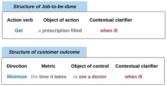 Example of job-to-be-done and outcome. Note: In the medical service process, if a patient, i.e., customer, is ill and visit the hospital, the reason why the patient gives personal information, sees a doctor, and describes symptoms is to get a prescription filled so that the patient can get take proper medicine and gets better. Therefore, the job-to-be-done that the customer is trying to achieve is to get a prescription filled. After having the prescription filled, the customer would evaluate the entire experience beginning from visiting the hospital to leaving the hospital. If the customer thinks that the time it takes to see a doctor is important and the time needs to be shortened, the outcome that the customer wants from the medical service is to minimize the time it takes to see a doctor. If the hospital wants to innovate their services for increasing customer values, reducing the time it takes to see a doctor would be a good strategic direction.