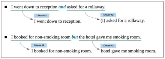 When conjunctions are placed between sentences and clauses, it can identify by using the same method. When conjunctions are placed between sentences or clauses, the token that comes after the conjunction is a noun phrase, and it has a parent token whose Part-of-speech (POS) is a verb. In such a case, the latter sentence or clause is detached with a conjunction. If a conjunction is attached to the former sentence or clause, it makes them an incomplete sentence, which could make the further analysis more complex. It is relatively easy to identify conjunctions between nouns. The sentence, such as “I asked for early check-in and extra roll-away,” is the case where a conjunction is placed between nouns. Suppose tokens that come before a conjunction are only nouns. If adnominal tokens and noun tokens that come after a conjunction and before a verb share the same verb, then the conjunction is introducing additional subjects. In such a case, the sentence is not parsed, and subjects are extracted as the subject in SAO structure as a whole, including conjunctions.