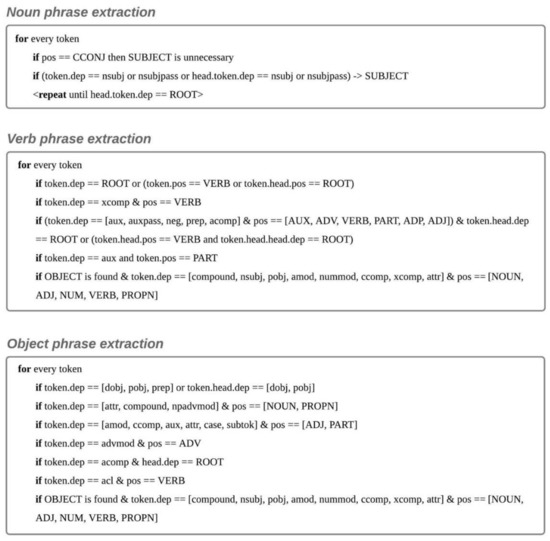 Pseudocode for extracting subject phrase, verb phrase and object phrase is as shown in Figure 5. A sentence that starts with a conjunction should be considered to extract noun phrases. In the previous issue, one sentence that multiple sentences are connected by conjunctions is parsed into independent sentences. In such a case, the latter sentence may share the same subject as the former sentence and hence, the subject token is missing. To solve this problem, we assumed the clause shares the same subject with the previous clause when the sentence starts with a conjunction, and the subject is missing.