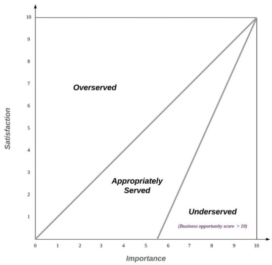 ODI framework defines business/service opportunities as desired outcomes that are important, but current satisfaction from the existing services is low (Figure 6). Based on this, ODI calculates the degree of service opportunity based on the gap between the importance and satisfaction score for the outcome. Specifically, ODI quantifies the importance and satisfaction of outcomes on a scale from 0 to 10. The formulation of service opportunities is as follows: