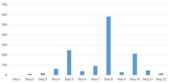 We collected customer reviews from Trip Advisor (www.tripadvisor.com). Since reviews with low ratings generally have rich information to find customer needs, reviews rated as one or two points/stars out of five were only considered as the data set. Three hundred eighty-five reviews on Royal Plaza Hotel from 2008 to 2018 were collected in such conditions. Four thousand six hundred fifty-four sentences were extracted, but 1361 sentences were selected as the final data set after cleaning noise sentences; 85% of the sentences were used as the training set, and the rest 15% were used as the test set. Figure 7 shows the occurrence distribution of sentences for each step in Service job map. No sentence was assigned to step 1: “Contact the service provider and/or access service”. This step is about customers contacting the hotel for the first time, such as a phone call or website visit. Those actions were not found in customer reviews. Reviewers tend not to mention how they first contacted the hotel. The first interaction that reviewers often mention is “booked room”, which is step 4: “Confirm and/or finalize service plan”. Since steps 1–3 are done before they arrive at the hotel, there were little reviews related to the step 1~3.