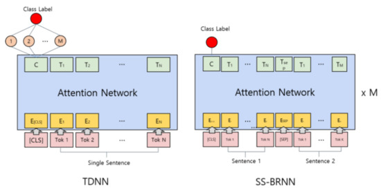 Recurrent neural network (RNN) as the representative deep learning algorithm for NLP encodes information given until time step t-1 into hidden internal state and computes it with new information given at time step t [21]. This incorporation of previous information enables RNN to conduct more sophisticated text classifications by considering semantic relationships. However, RNN inherently suffers from exploding or vanishing gradient problem [22]. Tokens must be transformed into a vector in order to be fed into a neural network. GloVe [23], Word2Vec [19] and FastText [24] are a pre-trained word embedding model that converts a token into a vector. Neural networks understand the meaning of a sentence by calculating the vectors in a variety of ways. Vanishing gradient problem occurs if the information on early tokens is diluted when the last token is calculated. If a sentence has n tokens, the first token’s vector is multiplied with the same matrix at least n times. If the matrix has an element less than 1, which is what most matrixes are, the final value would be so small that the gradient vanishes. If the gradient is too small, the neural network becomes untrainable since feedforward neural networks such as RNN are trained by a backpropagation algorithm [25]. The longer the sentence is, the bigger the problem of vanishing gradient is. The attention network is a network that is free from the vanishing gradient problem. It can incorporate context information efficiently since it allows modeling of dependencies without regard to their distance in the input or output sequences [26]. Using an attention network, neural networks can process complex semantic information. More recently, BERT, the pre-trained language model, was suggested based on the self-attention mechanism used for attention networks [11]. BERT trains a universal language model from the massive corpus and so can be utilized for many NLP tasks by fine-tuning. In particular, since BERT has achieved great performances in sentence-level NLP tasks, it is suitable for our purpose for sentence classifications.