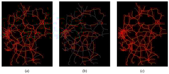Different stages of network coverage after Steps 2 (a), 4 (b) and 5 (c). The rightmost image depicts the final network coverage. Road sections highlighted in red are traversed by at least one route request.