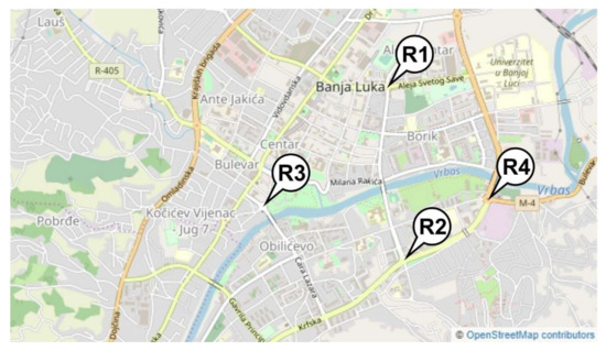 Positions of the analyzed intersections in the street network of the town of Banja Luka.