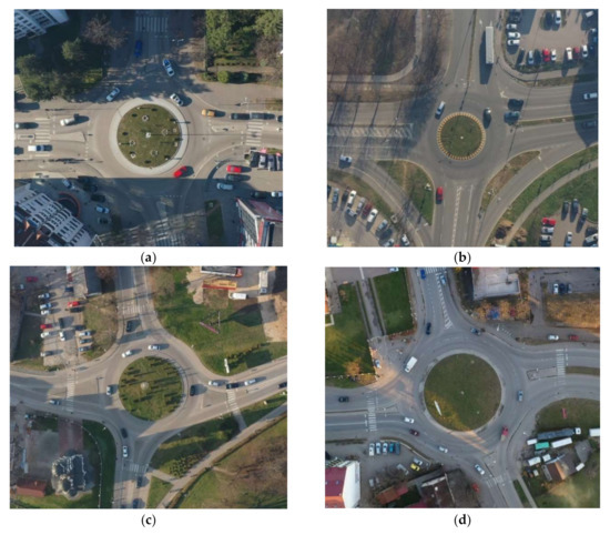 Data collecting was conducted by recording real traffic flows at four urban roundabouts. The recording was carried out by means of a drone “DJI Mavic 2 Pro”, which was set at a certain height above the analyzed roundabouts and it recorded traffic. The analyzed intersection is in Banja Luka (Bosnia and Herzegovina), a town with around 180,000 inhabitants. The intersections used for data collecting are in the urban area of the town, and their type belongs to mid-sized roundabouts and large town roundabouts. In the City of Banja Luka, there are a total of 15 roundabouts, out of which 9 are urban roundabouts. A sample of 4 out of 9 urban roundabouts covered all types, taking into account the characteristic geometrical parameters to be analyzed. The researched intersections are at the edge of the central zone of Banja Luke, with AADT of around 20,000 veh/day. Traffic for trucks is prohibited on these roundabouts. In addition, during the observed period, no occurrence of buses was recorded at the intersections or the number of buses was negligible. Given such a structure of traffic flow, only the speeds of passenger cars were analyzed in the paper, in other words, the analysis was performed on the basis of a homogeneous traffic flow composed of passenger cars.