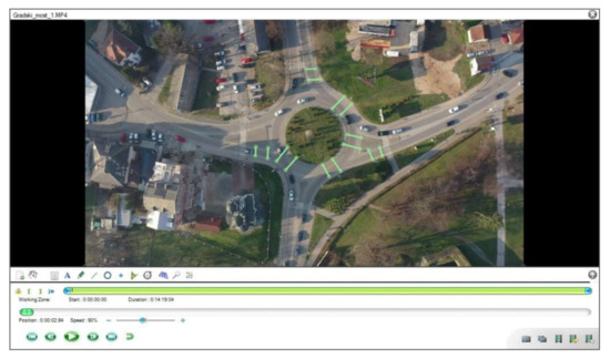 For determining the vehicles’ speed, the method of video recording processing and analysis was used. Video recording processing proved to be an extremely efficient method for traffic flow parameters measuring, because its use minimizes the influence of the research on the drivers. The applied method enabled the analysis in real traffic flow, in which the speed of traffic flow depends exclusively on the degree of interaction between vehicles and the geometric characteristics of the intersection. Data collected and processed in this way represent an efficient and practical basis in many research studies of traffic flow parameters [36,37]. The collected video material of the frequency 24 fps was processed with the software package Kinovea (Figure 4), which enables referential lines marking, the analysis of the objects movements in the recording, and the recording survey by sequences in the accuracy of approximately 0.042 s. The measured speed represents the mean spatial speed measured between two referential lines at the measuring area.