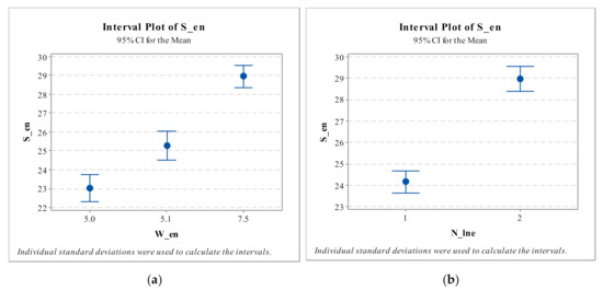 Interval plot of S_en: (a) depending on the factor W_en; (b) depending on the factor N_lne.