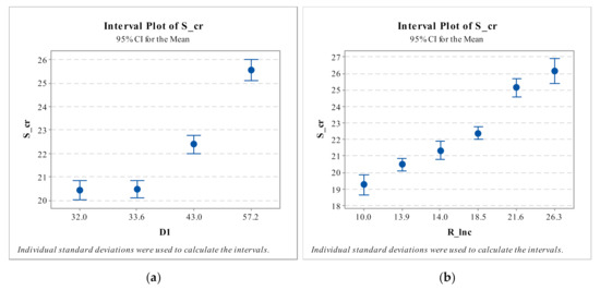 Interval plot of S_el: (a) depending on the factor W_ex; (b) depending on the factor N_lnx.